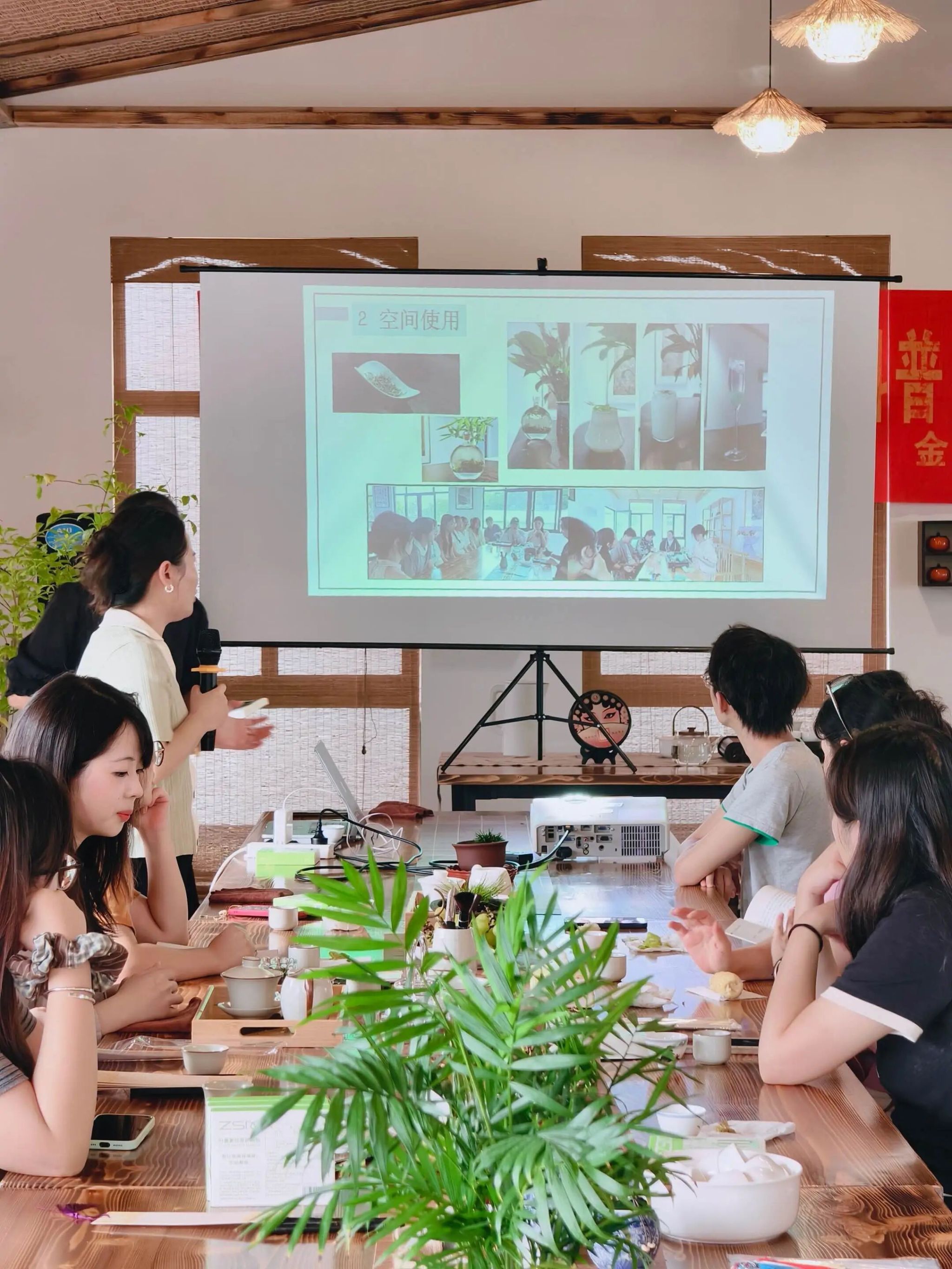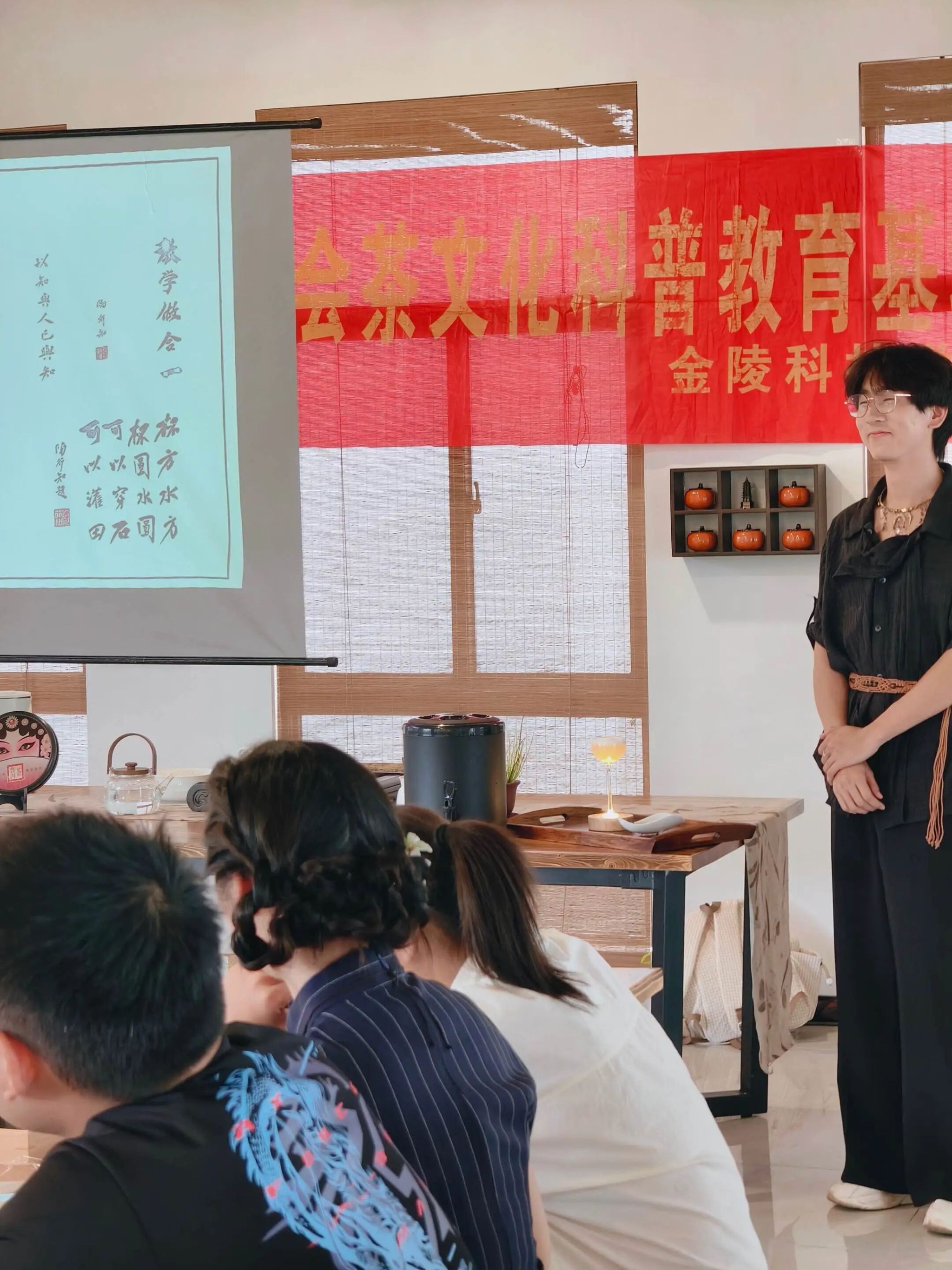 茶会伊始,茶团队教师带领师生共同追溯行知茶园的历史渊源。行知茶园由金陵科技学院新建,其理念源自陶行知先生早年于晓庄学校的育人实践。陶先生曾将学校后方的茶园改造为“中心茶园”,使之不仅成为师生与乡邻品茶交流的场所,更成为践行“社会即学校”教育思想的重要阵地。当年悬挂的“嘻嘻哈哈喝茶,叽叽咕咕谈心”对联,生动映照出平等亲和、教学相融的氛围。如今,行知茶园正是对当年“中心茶园”的复建与延续,自规划建设之初即以“以茶载教”为核心理念,致力于打造一个融合文化传承与实践教学的校园茶文化空间。随后,范俊俊老师结合茶事案例,深入讲解陶行知先生“教学做合一”的理念,推动理论与实践的深度融合。师生们通过书写“爱满天下”“教学做合一”等主题卡片,进一步加深了对行知精神的体悟与理解。