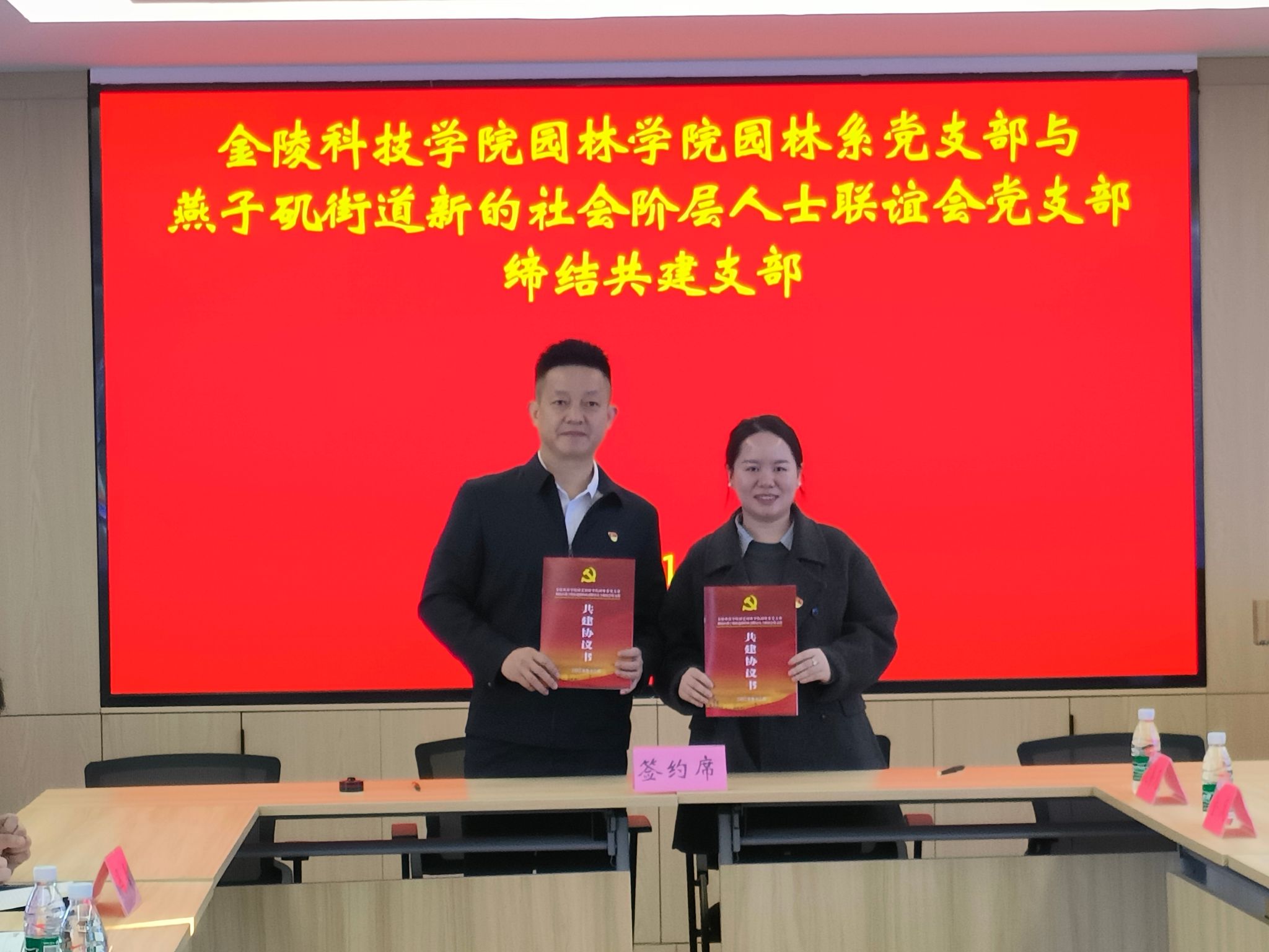 为深入贯彻落实新时代党的建设总要求,推动高校党建与基层社团党建深度融合,2025年12月3日下午2:30,金陵科技学院园艺园林学院园林系党支部(以下简称“园林系党支部”)与燕子矶街道新的社会阶层人士联谊会党支部(以下简称“新联会党支部”)支部共建缔结仪式在燕子矶街道燕知汇园区新联会阵地隆重举行。燕子矶街道相关领导、金陵科技学院园艺园林学院园林系党支部成员、燕子矶街道新联会党支部及新联会班子成员共同参加了此次活动。