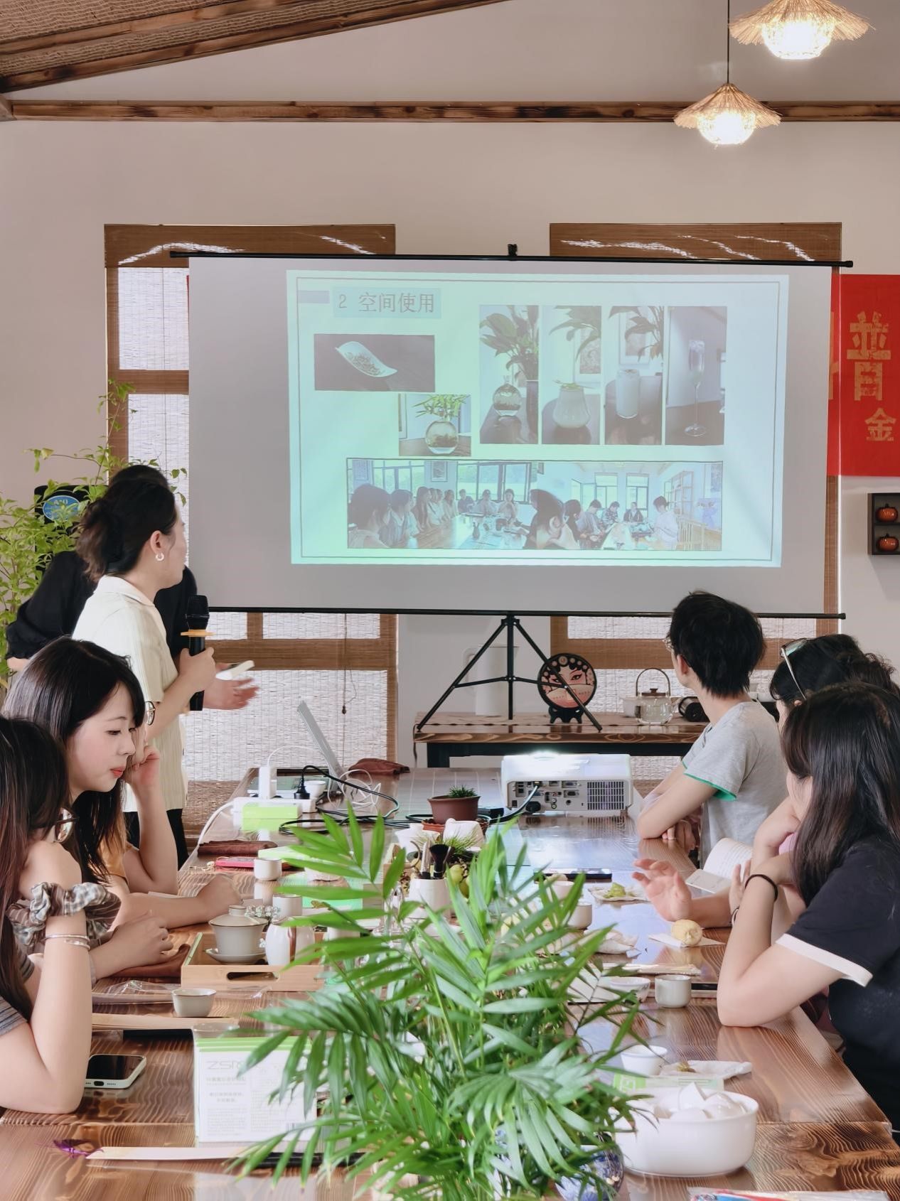 在活动过程中,老师们实地探访了茶空间的不同功能分区,直观感受“行知式”茶空间的设计巧思。传统茶艺室里摆放了盖碗、紫砂壶等传统茶具,轻茗茶社社长徐郑骅在此演示茶艺冲泡,温杯、投茶、注水间尽显传统茶韵,让老师们在观摩中学习传统茶礼;在新式茶饮室里,由茶社社员庄学彬带来自创新品“月华”,以安吉白茶为底、融入灯笼果风味,用“玉盘清辉映杯盏”的诗意诠释创新茶味,展现茶文化的当代表达。
