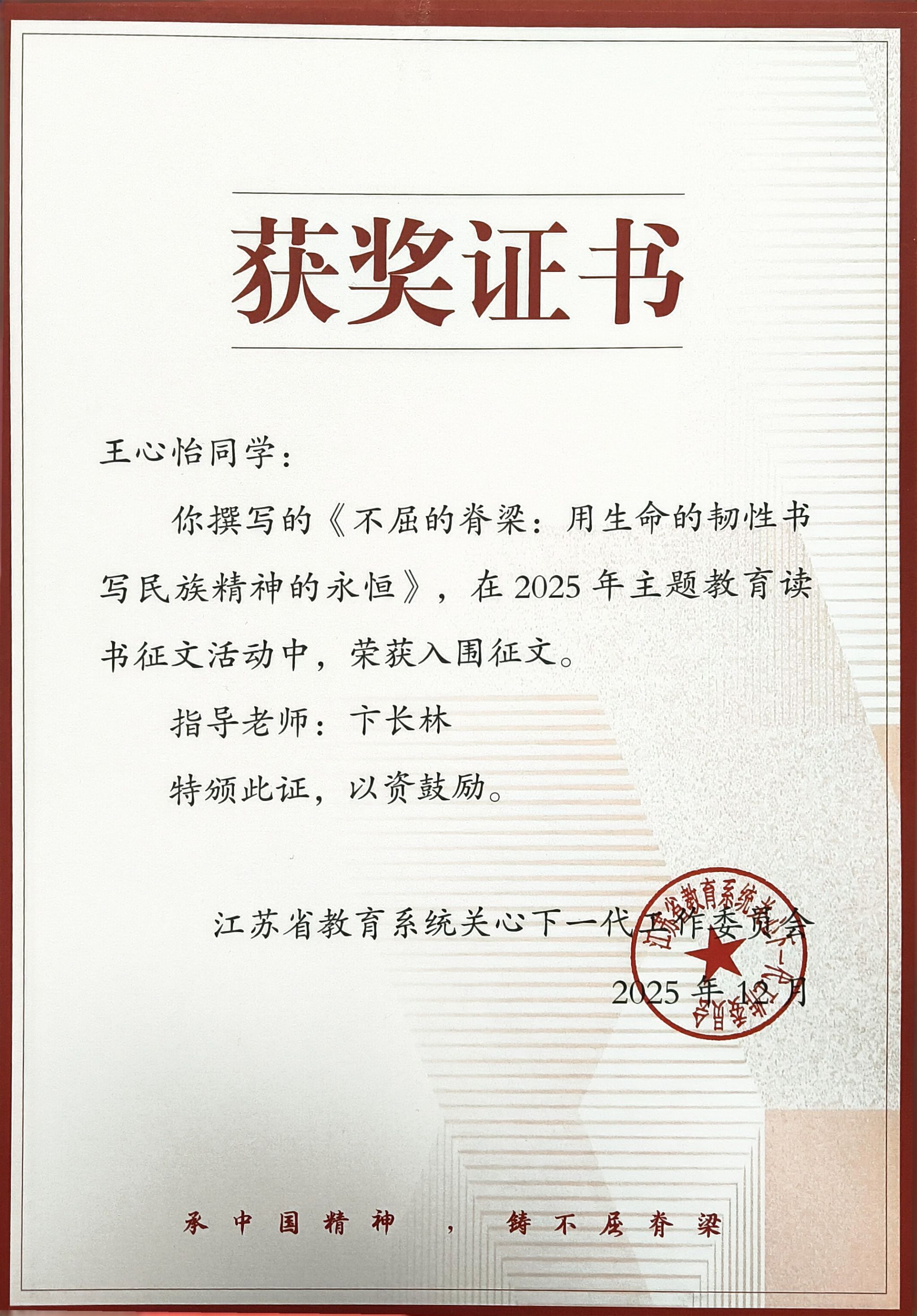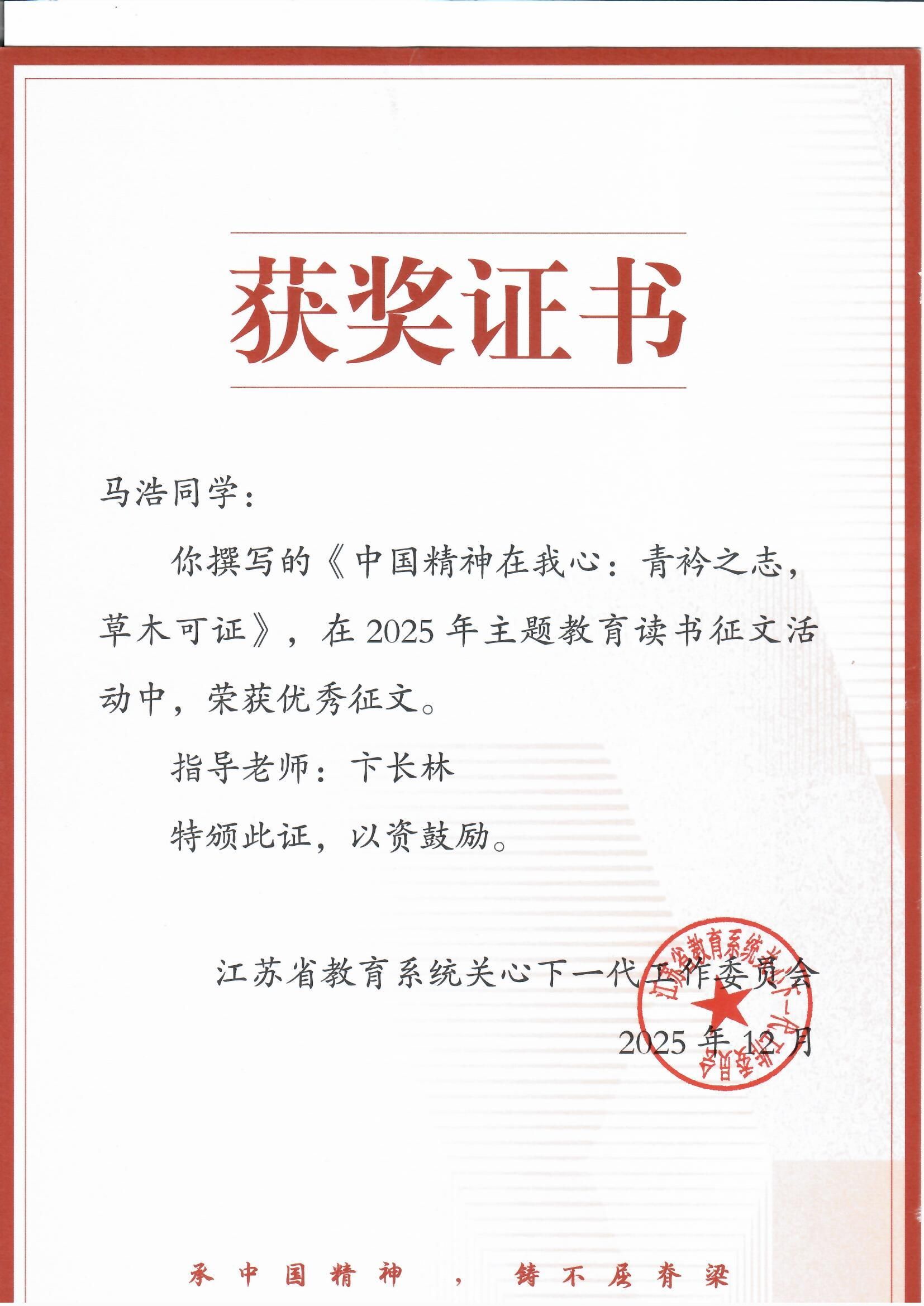 近日,江苏省教育系统关工委公布2025年主题教育读书征文评选结果(苏教关委[2025]12号),我院马浩同学《中国精神在我心:青衿之志,草木可证》荣获优秀征文奖,王心怡同学《不屈的脊梁:用生命的韧性书写民族精神的永恒》荣获入围征文奖。